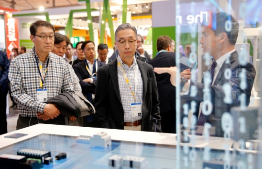 ¹ÚÁö¿ø µÎ»ê±×·ì ºÎȸÀåÀÌ Çϳë¹ö ¸Þ¼¼ 2019 Àü½ÃȸÀÇ µ¶ÀÏ Áö¸à½º(Siemens) Àü½Ã°ü¿¡¼­ °ü°èÀÚÀÇ ¼³¸íÀ» µè°í ÀÖ´Ù.[µÎ»ê Á¦°ø]